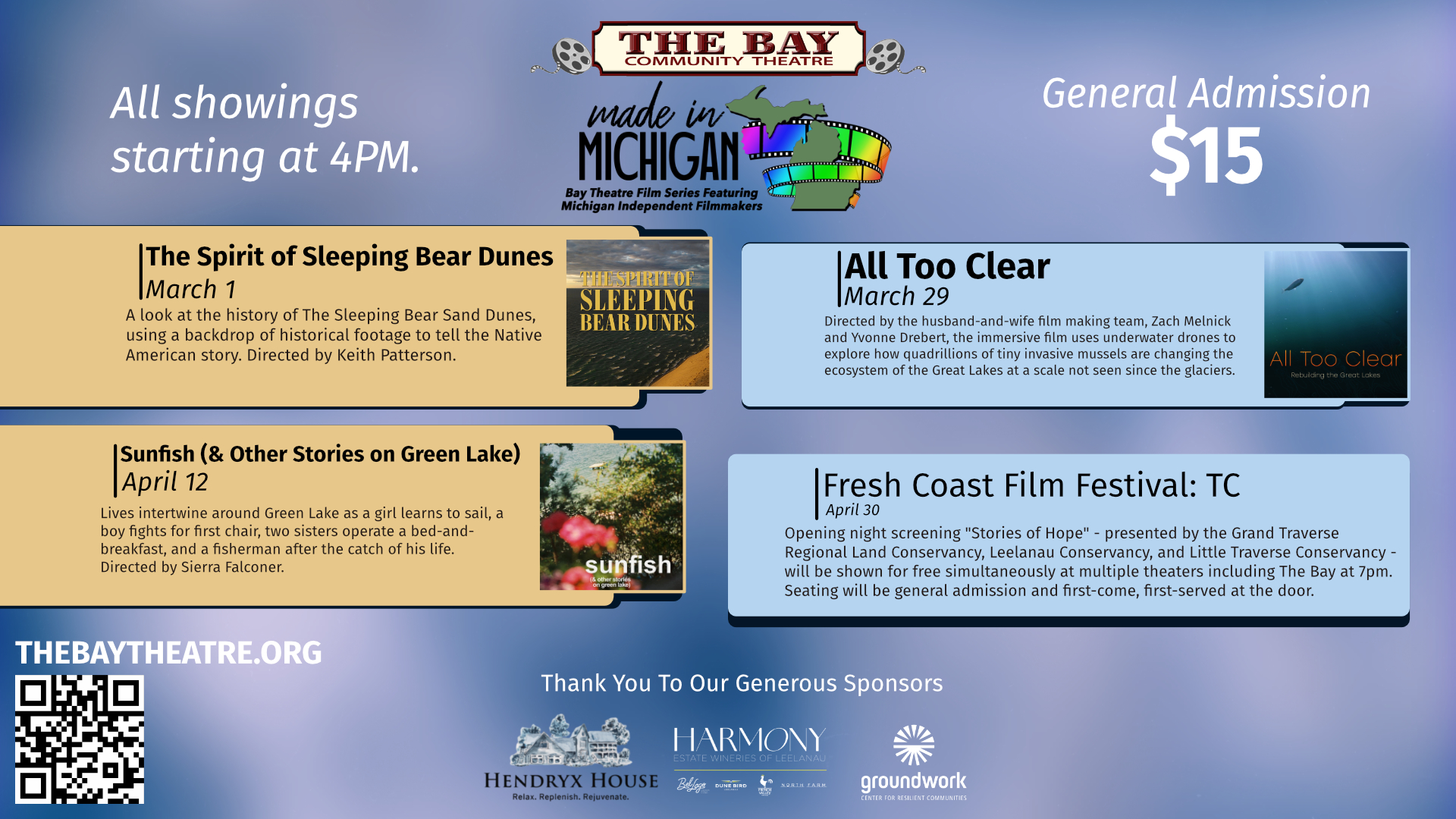 Sunfish is a sun-dappled, atmospheric portrait of life on a single body of water. Directed by Sierra Falconer and premiered at the 2025 Sundance Film Festival, the film weaves together four loosely interconnected vignettes that capture the quiet, transformative power of a Michigan summer. Connect with filmmaker Sierra Falconer at the Bay for this special showing!DramaPT1H27M2026-04-12Maren Heary